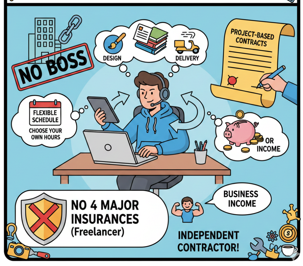 - 프리랜서: 특정 조직에 속하지 않고 프로젝트 단위로 계약하며, 대가 지급 시 3.3%의 원천징수 세액을 공제받는 ‘인적용역 사업자’를 말합니다. 별도의 사업자등록증이 없는 상태입니다.